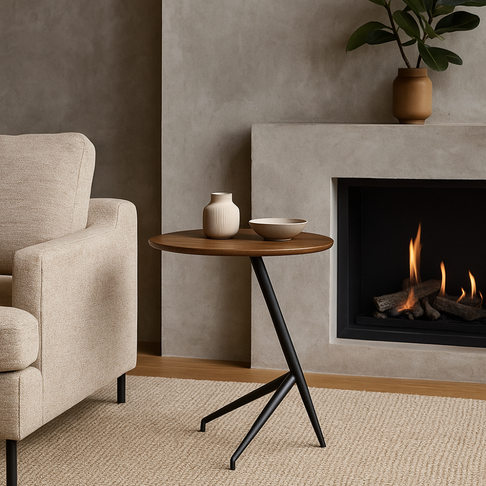 طاولة جانبية بتصميم عصري بسيط بسطح بيضاوي وقاعدة معدنية أنيقة.