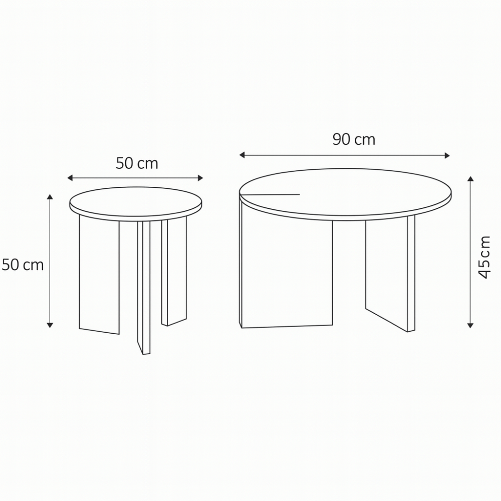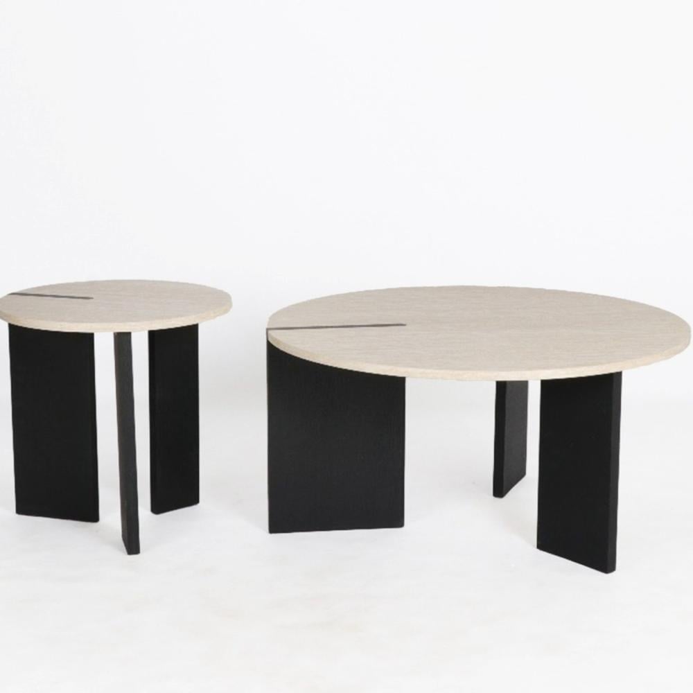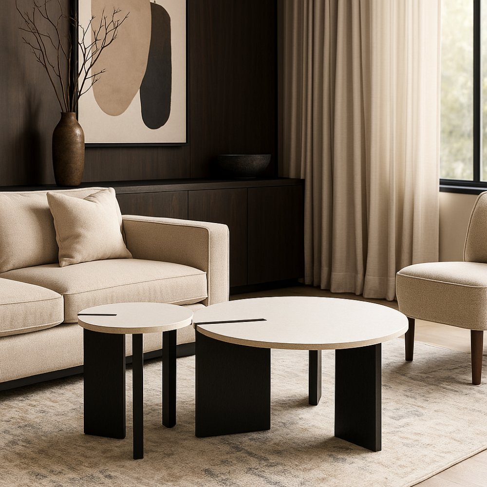 طقم طاولات عصري بتصميم أنيق يجمع بين السطح الخشبي الفاتح والقواعد السوداء الحديثة.