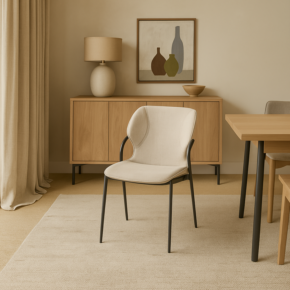 كرسي أنيق بتنجيد بيج وهيكل معدني أسود، يجمع بين الراحة والمتانة بتصميم عصري