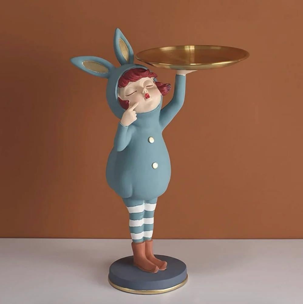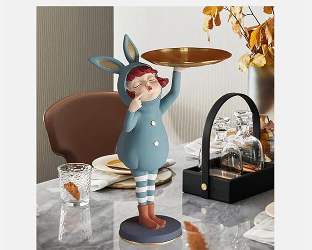 مجسم ديكوري لطيف باللون الأزرق مع صينية أنيقة للديكور أو التقديم.