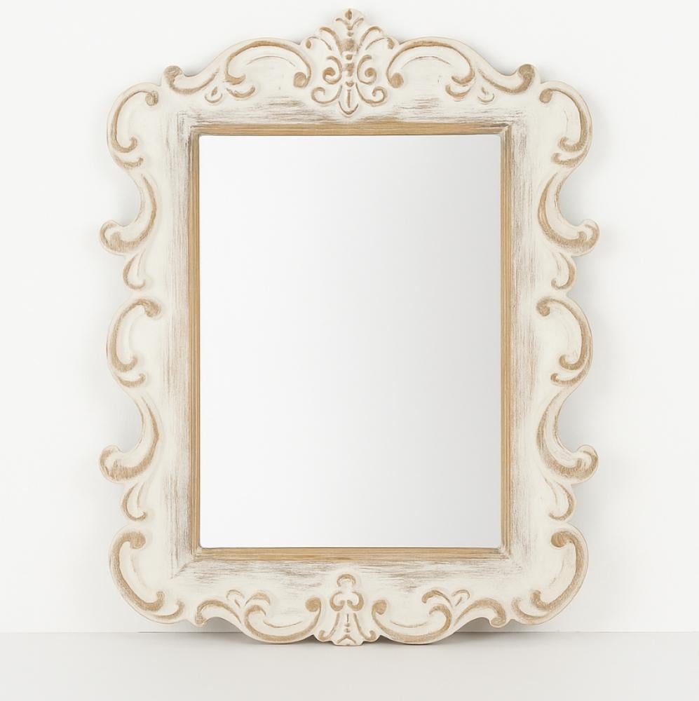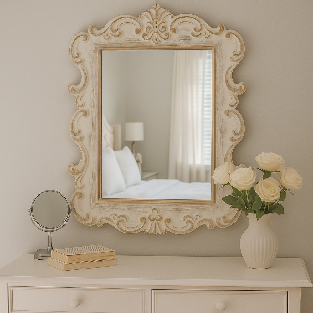 مرآة بإطار خشبي مزخرف تضيف لمسة فخامة كلاسيكية للمكان.
