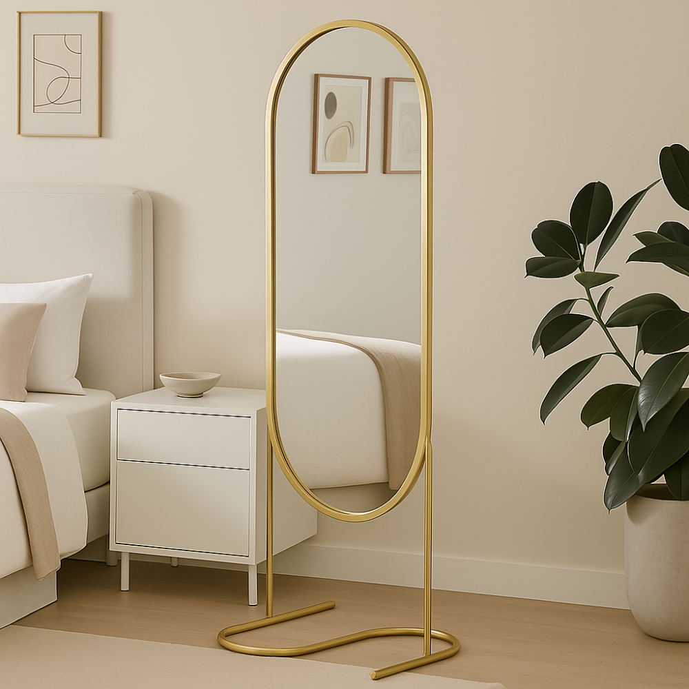 مرايا طويلة باستاند حديد ذهبي ثابت، فخامة وأناقة لديكور منزلك، مثالية للمداخل وغرف النوم والمعيشة وأي مساحة تحتاج لمسة جمالية.