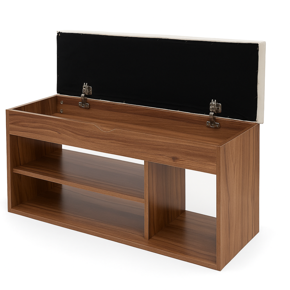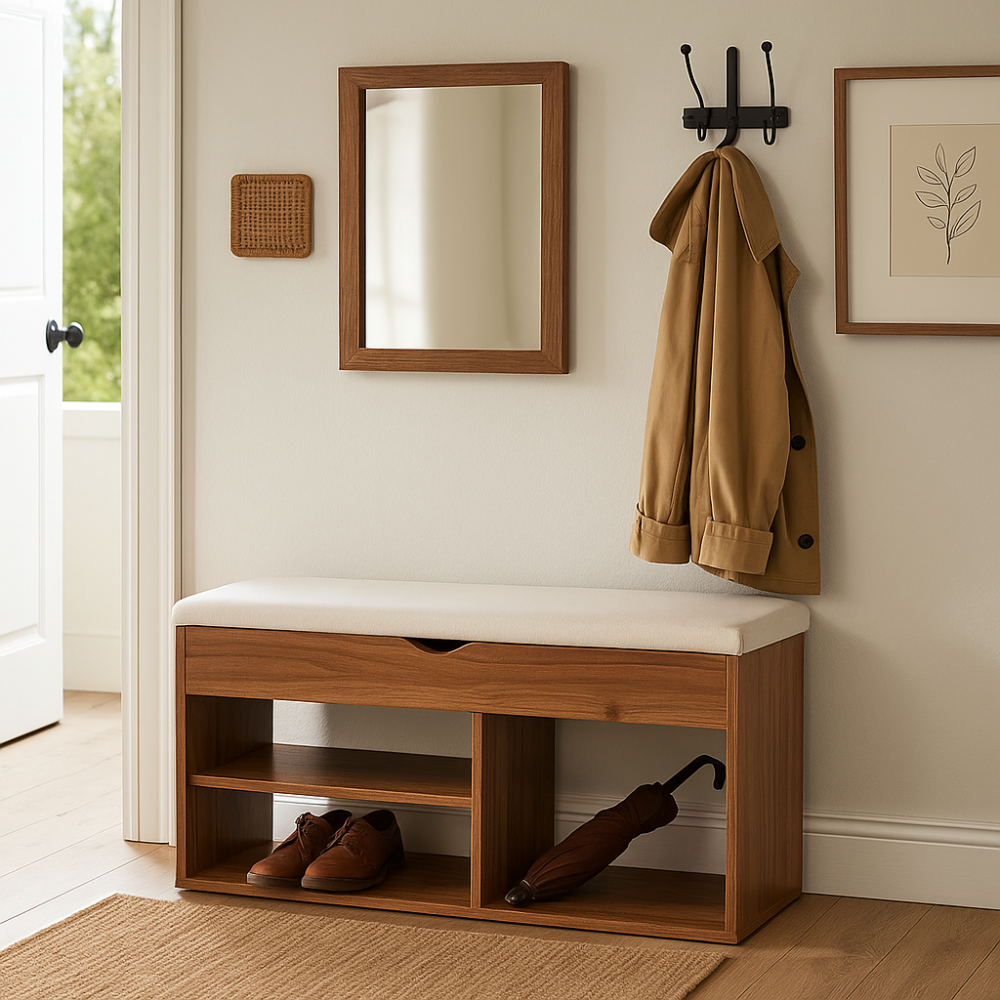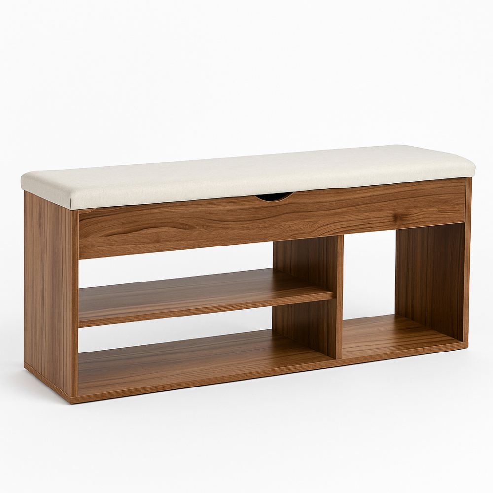 مقعد خشبي أنيق بوسادة مريحة ورفوف تخزين عملية.